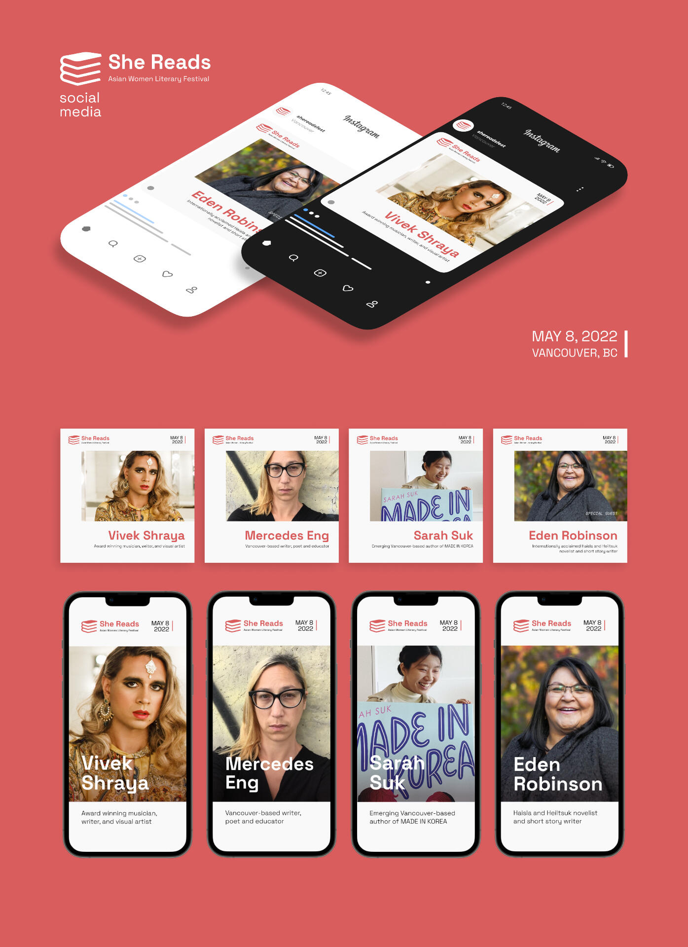 The festival will build up a public following via social media accounts on Twitter, Facebook, Instagram and TikTok, which will all direct viewers to the festival website, where information about the event dates, programmed speakers, ticket and merchandise sales, and partner details can be found in one place. On those social media platforms, the festival will begin posting 6 months before the event, in December 2021, to build anticipation for the event on May 8, 2022. All platforms will use the hashtag “#SheReads2022” on all primary posts, and tag the authors where applicable. Square media will be used for posts on Instagram, Facebook and Twitter, while the phone mockups at the bottom would be used on Instagram.